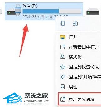 1、打开此电脑,找到并选中,被加密的磁盘,在打开的菜单项中,选择显示更多选项。