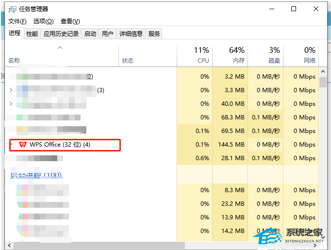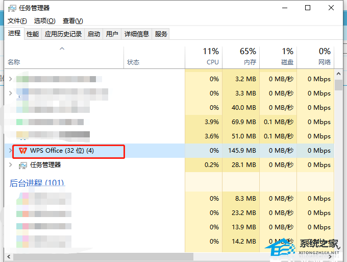2、进入到任务管理器窗口后,用户直接在窗口中可以看到正在运行的所有应用程序,需要找到wps软件。