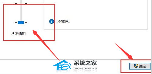 3、然后将窗口左侧中的滑块滑动到最底部“从不通知”处,最后点击右下角的“确定”就可以了。