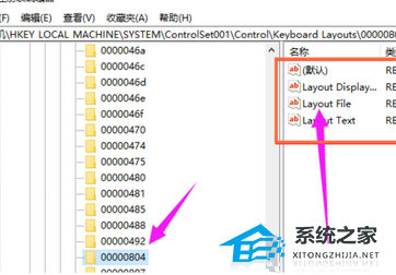 2、打开注册表编辑器,点击路径【HKEY_LOCAL_MACHINE\ SYSTEM\ControlSet001\Control\Keyboard Layouts】,仔细检查,会发现以0804结尾的都是简体中文输入法。