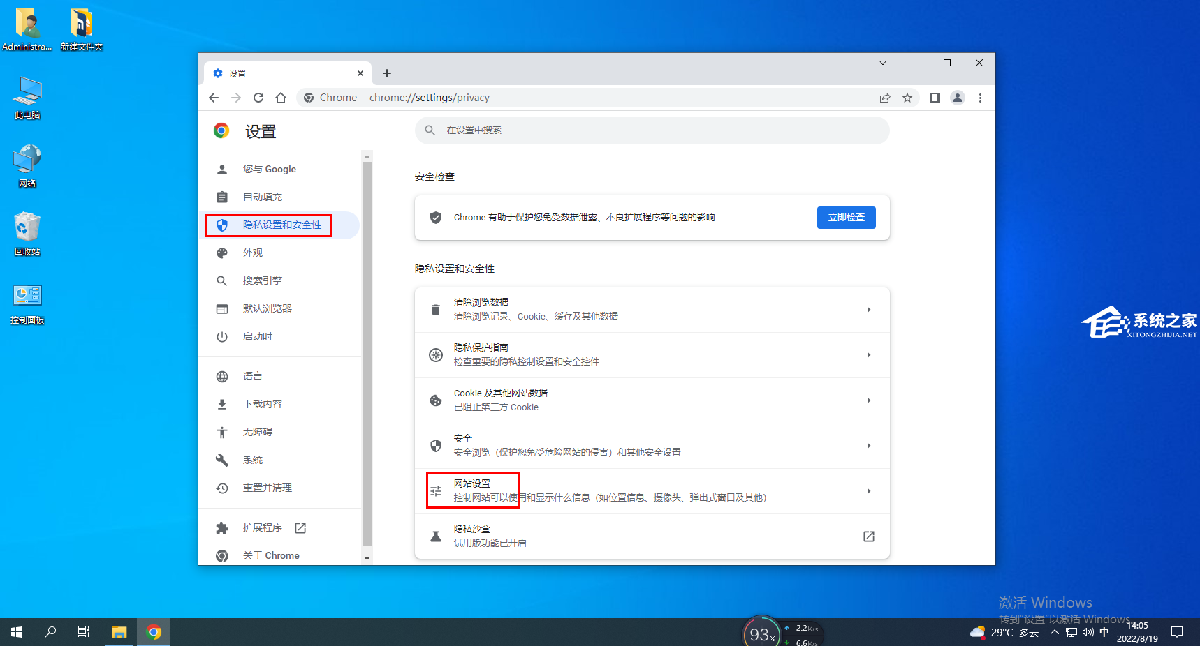 2、进入新界面后,点击左侧的“隐私设置和安全性”,找到右侧中的“网站设置”选项。