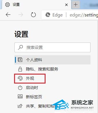 3、这时会打开Edge浏览器的设置页面中,在页面左侧的导航菜单中点击切换到“外观”设置页面中。