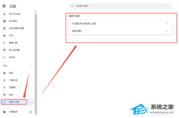 2、在左边导航栏中点击“高级”,选择出现的“重置并清理”这个选项,点击后右侧会出现两个选项“将设置还原为原始默认值”以及“清理计算机”,点击第一项“将设置还原为原始默认值”,最后再重新打开浏览器尝试下问题是否修复解决。