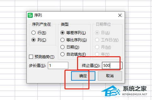 6、在打开的序列窗口中,用户直接在终止值选项中输入500并按下确定按钮。