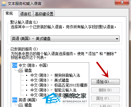 2、之后会弹出如图的窗口,我们在右侧点击添加按钮,在里面添加一个中文输入法,有的时候是因为我们将中文输入法不小心在设置里删除。