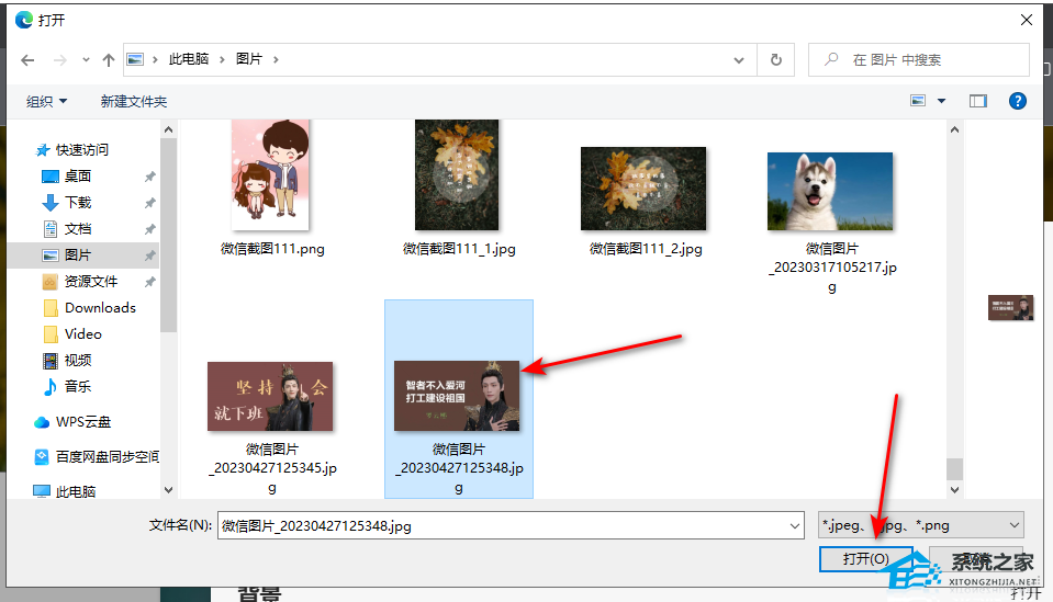 6、在打开的窗口中,将图片文件夹点击打开,选择自己平常觉得非常好看的图片,之后点击打开按钮进行添加到背景页面中。