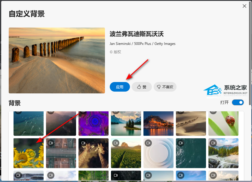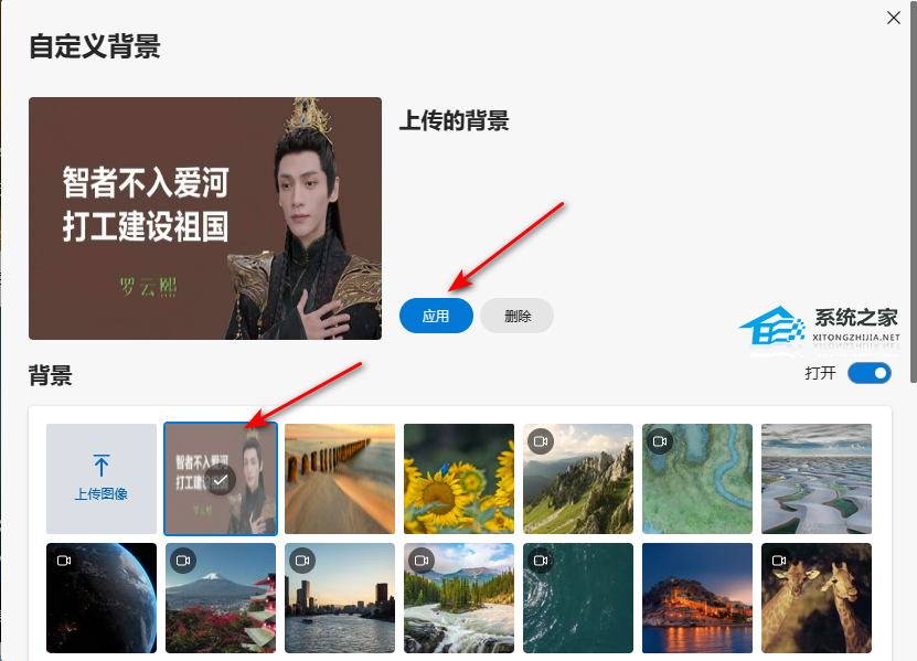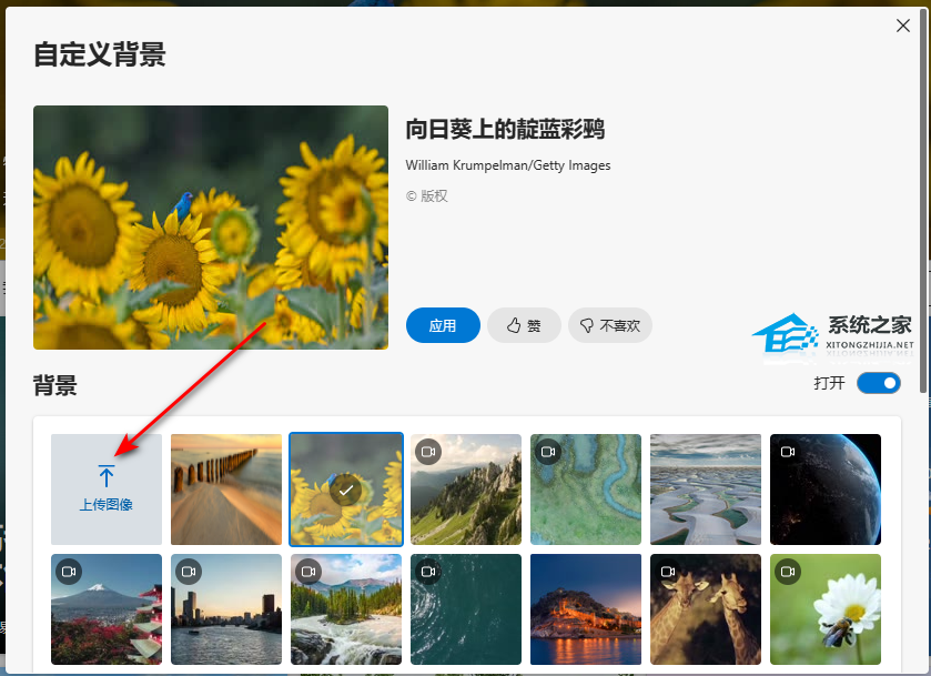 3、在打开的自定义背景的窗口中,你可以看到我们有很多的背景图片可以选择,你可以选择其中自己觉得好看的图片进行应用。
