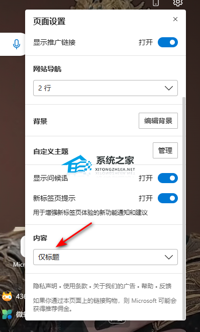 9、这时你进入到设置页面中,将【内容】设置成为【仅标题】,那么我们的主页就会将整个主页的背景都显示出来,这样看起来更加的美观。