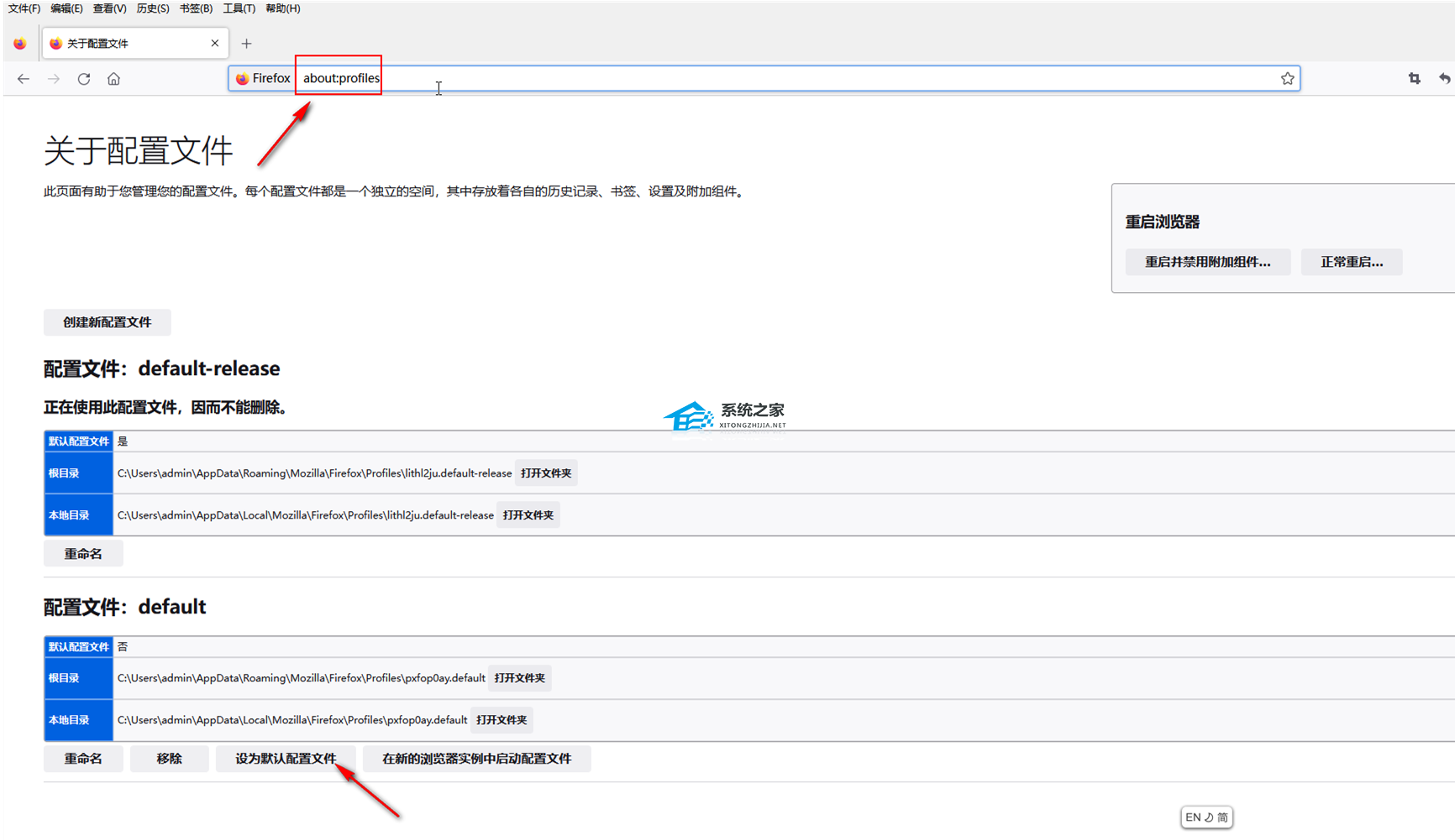 第二步:方法1.在界面上方地址栏输入about:profiles并按enter键,在搜索结果中将第一个或者第一个设置为“默认配置”文件,然后关闭软件,重新双击打开Firefox火狐浏览器;