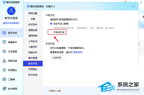 3、在打开的窗口界面中,点击左侧栏中的“版本升级”选项,然后找到右侧中的“升级方式”一栏,将其中的“不自动升级”勾选上。