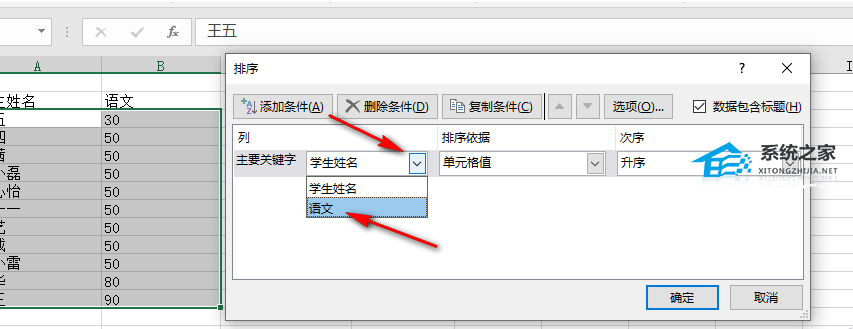 4、在排序弹框中,我们先点击打开“主要关键字”选项,然后在下拉列表中点击选择成绩一列的标题,图中需要排序的是语文成绩,所以下拉列表中选择的是“语文”。