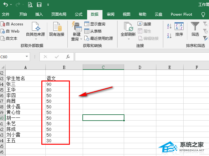 2、进入Excel页面之后,我们选中需要进行排序的成绩区域,然后在工具栏中点击打开“数据”选项。