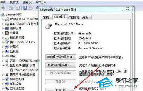 5. 在鼠标属性页中,有关于驱动程序的详细信息,在最下面是一个卸载按钮,这就是卸载驱动的按钮,用鼠标点击这个卸载按钮,卸载当前的鼠标驱动。