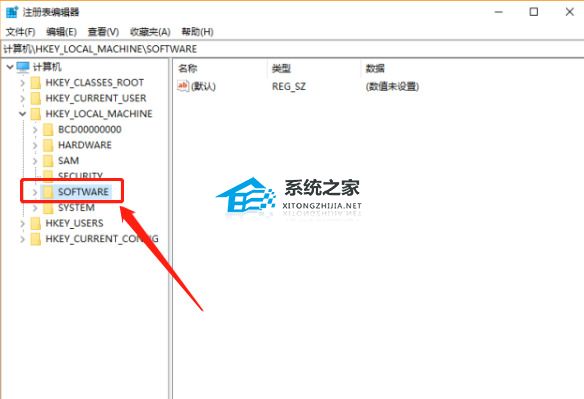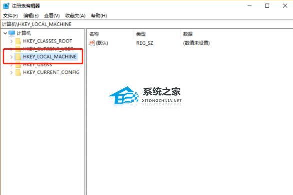 3、进入注册表编辑器页面,找到“HKEY_LOCAL_MACHINE”文件夹后点击文件夹前面的标识符号展开文件夹。