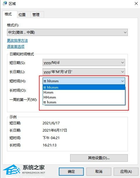 3、然后在区域界面的【格式】选项卡下方点击短时间下拉框,将其设置成【H:mm】或者【HH:mm】。