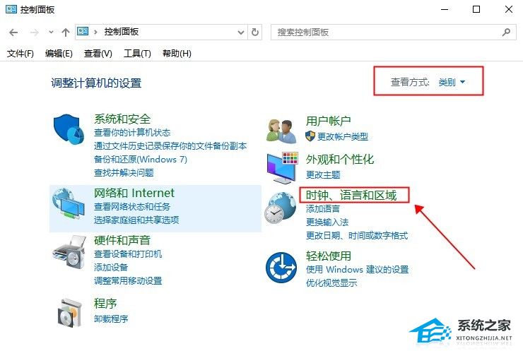 1、在电脑上打开【控制面板】,将右上角的【查看方式】设置成【类别】,再点击下方的【时钟、语言和区域】。