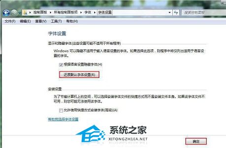 3. 选择“还原默认字体设置”,再点击“确定”即可。