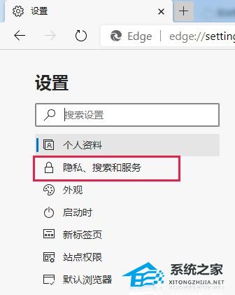 3、进入Edge浏览器的设置页面后,在页面左侧的导航栏中点击切换到“隐私、搜索和服务”设置页面。