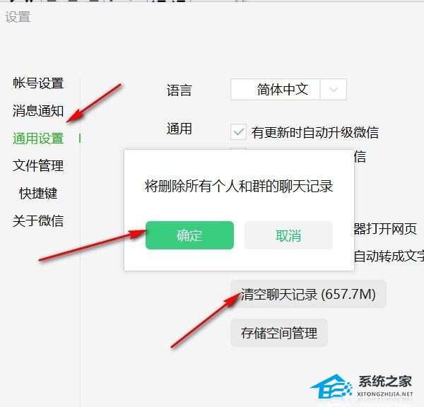 5、我们也可以点击设置页面中的“通用设置”然后点击页面右侧的“清空聊天记录”选项,并在弹框中点击“确定”即可。