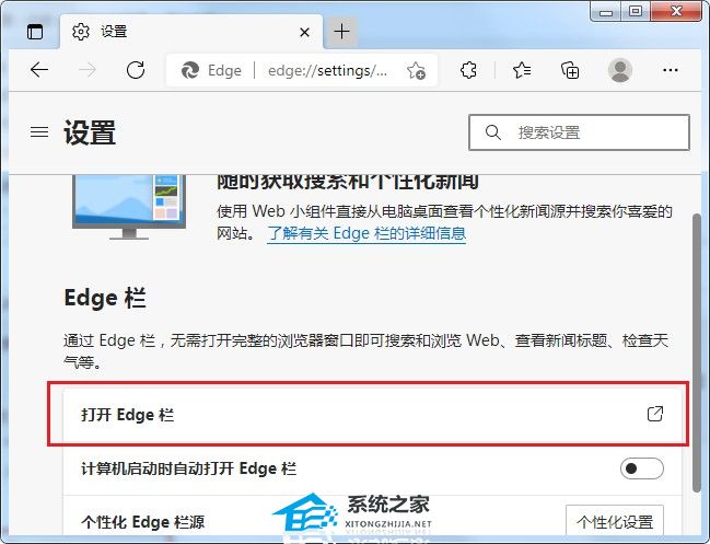 4、之后在页面右侧点击“打开Edge栏”就可以了,我们还可以开启“计算机启动时自动打开 Edge 栏”,这样每次开机的时候就可以直接看到。