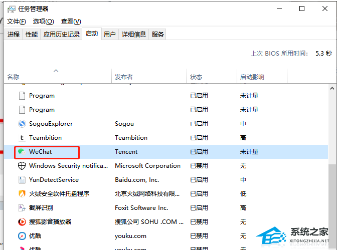 7、将会在下方显示出开机自启的应用列表,用户找到其中的微信选项并按下右下角的禁用按钮即可设置成功。