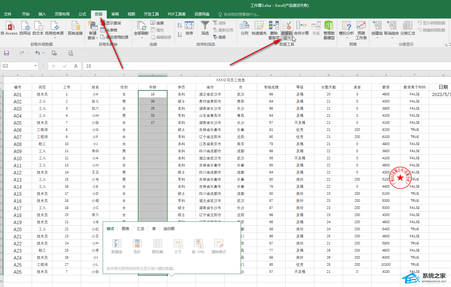 第二步:接着选中数据区域,在“数据”选项卡中点击“数据验证”;