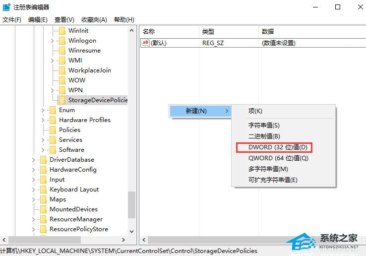 3、然后在StorageDevicePolicies项中新建一个名为WriteProtect的DWORD值,这样就可以解决问题了。