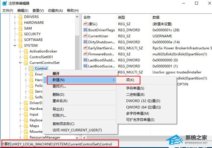 2、在注册表编辑器中依次点击HKEY_LOCAL_MACHINE\SYSTEM\CurrentControlSet\Control,右键点击Control,新建一个名为StorageDevicePolicies的项。