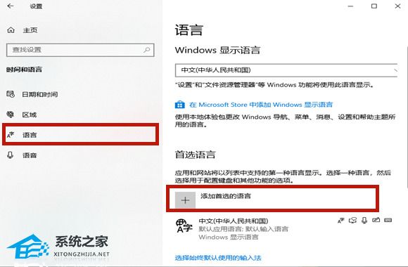 3、挑战到新页面以后选择【语言】,之后在右侧点击【添加首选的语言】。