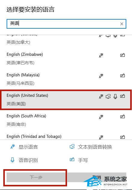 4、在选择要安装的语言当中输入【英语】,点击包含美国的选项,选择【下一步】。