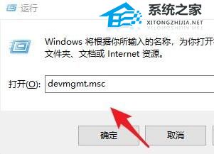 1、“win+R”快捷键开启运行,输入“devmgmt.msc”,回车打开。
