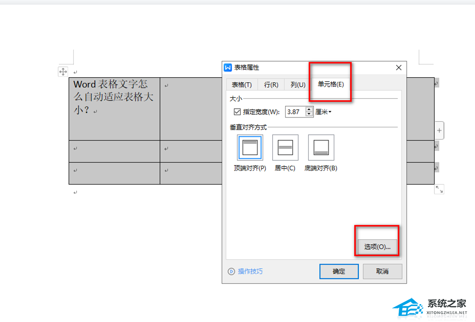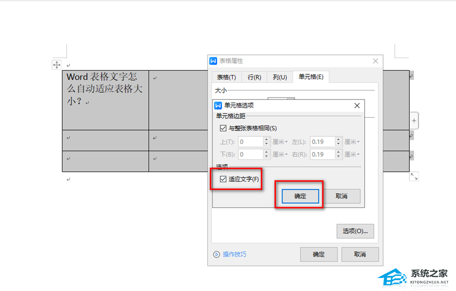 4、这时就会弹出一个选项的设置窗口,在该窗口中将【适应文字】这个选项进行勾选,之后我们点击确定按钮将该窗口关闭,之后再将刚刚打开的表格属性的窗口点击确定按钮关闭。