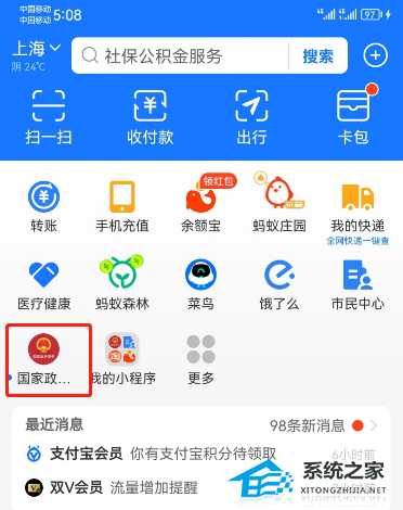 1、首先打开手机上的支付宝,然后在主页找到政务中心并且点击打开。