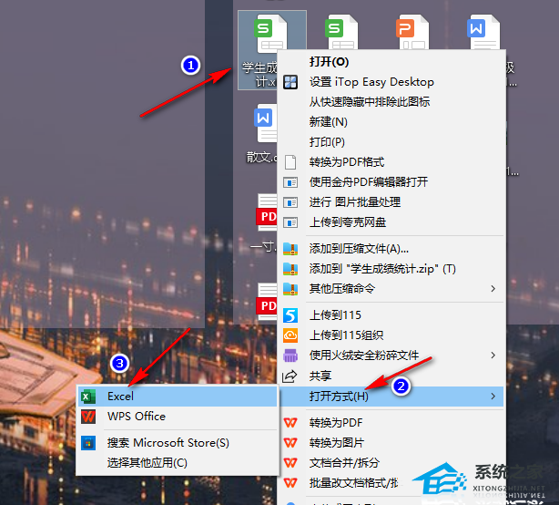 1、我们先在电脑中找到一个表格文件,然后右键单击选择“打开方式”选项,再选择使用“Excel”来打开该文件。