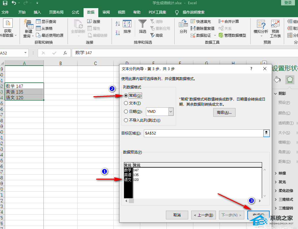 7、在导向的第三步页面中,我们选中数据预览中的列,然后在“列数据格式”中选择该列的格式,一般的文字和数据我们默认为“常规”,设置好之后点击“完成”选项即可。