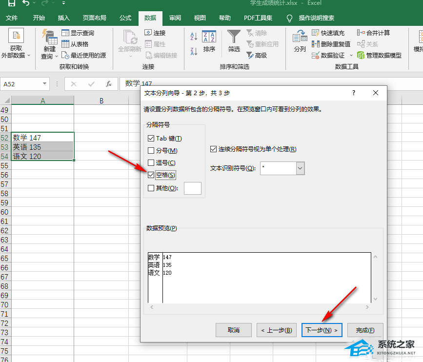 6、进入导向的第二步页面之后,我们在该页面中将分隔符号选择为“空格”,然后点击“下一步”选项。