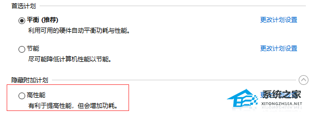 3、在这个窗口中请单击右侧的“高性能”,若是没有可以将“显示附加计划”展开。