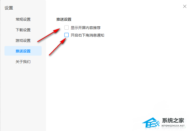 4、然后找到右侧中的“推送设置”一栏,最后将其中的两个选项小方框都取消勾选就可以了。