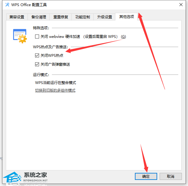 4、然后进入到新界面后,点击上方的“其他选项”选项卡,找到其中的“关闭WPS热点”,将其左侧小方框勾选上,最后点击确定进行保存就可以了。