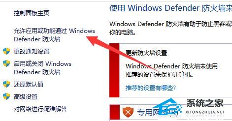 2、打开后,选择左上角“允许应用或功能通过windows defender防火墙”。