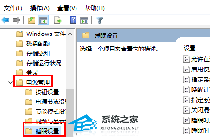 3、在本地组策略编辑器中,依次展开:计算机配置→管理模板→系统→电源管理→睡眠设置(如图所示)。