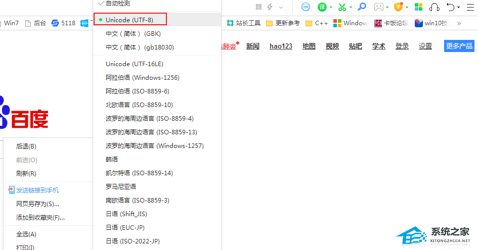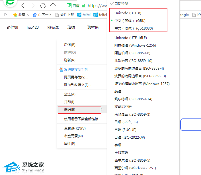 2、右击网页空白处,选择菜单选项中的“编码”,然后在二级菜单中的前三个选项之间来回切换试一下。