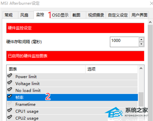 2、点击监控,在“已启用的硬件监控图表”点击你想监控的项目,以帧率为例,使帧率项变成高亮的蓝色,在“在OSD上显示”前的方框打勾。