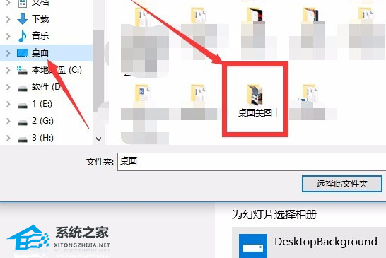 5、找到“桌面美图”文件夹后,单击选择,切记不是双击点进去,而是单击选择。对话框右下角,会出现“选择此文件夹”,单击即可。