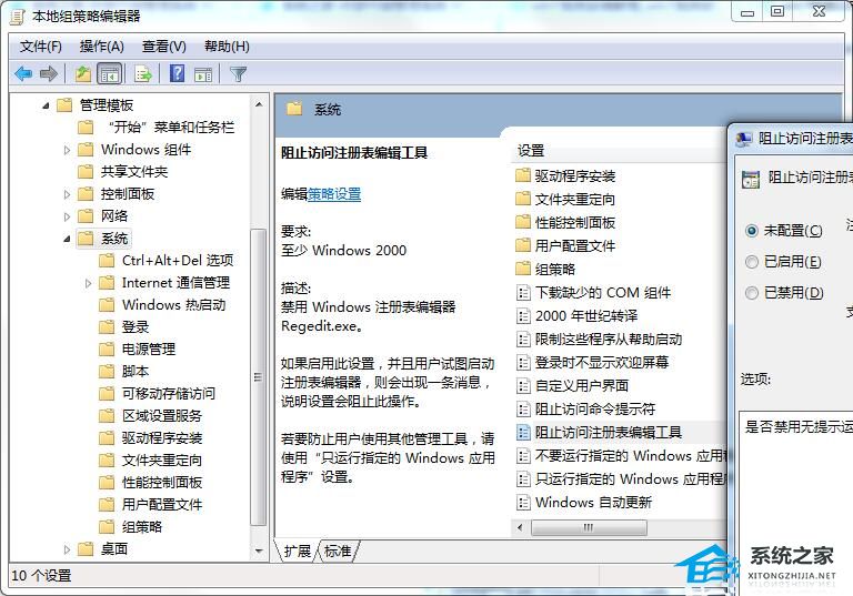 2. 访问:“用户配置”→“管理模块”→“系统”→“阻止访问注册表编辑工具”,双击打开有三个选项可选,未配置、已启用、已禁用,这里我们选择“未配置”或“已禁用”。