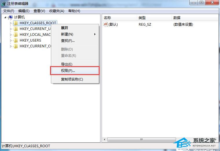 4. 在没有创建建值权限的注册表大类上单击右键→选择“权限”,在新弹出的权限设置窗口,点击“高级”。
