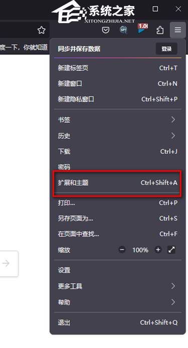 1、将火狐浏览器点击打开之后,我们可以将火狐浏览器右上角的【三】点击打开,选择【扩展和主题】。