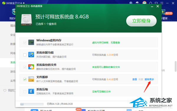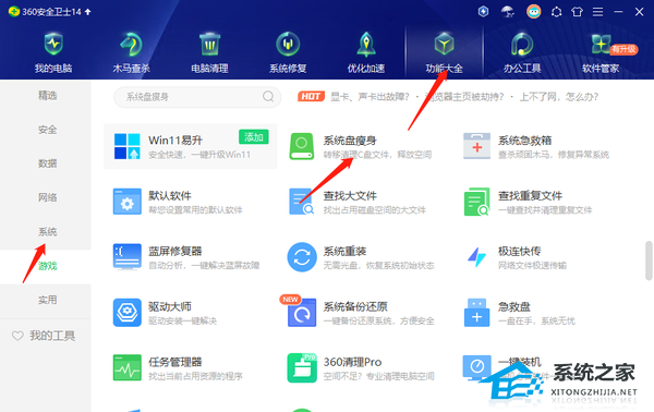 1、打开360安全卫士,点击上方【功能大全】进入,在【系统】功能中找到【系统盘瘦身】并点击。