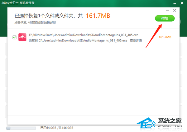 5、如果想将刚刚迁移的文件恢复到C盘中,点击【恢复】进入,然后选择该文件,点击上方【恢复】即可。