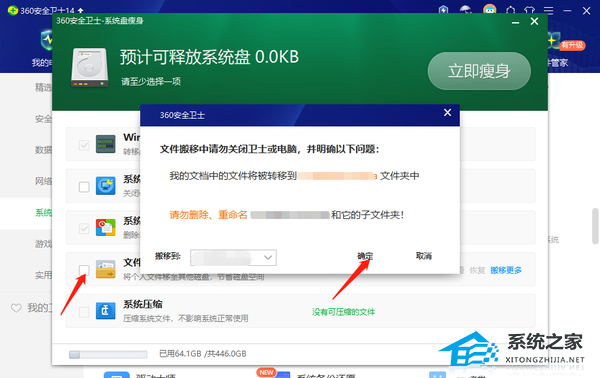 2、该功能会对C盘文件进行扫描,扫描结束后勾选【文件搬迁】,会弹出一个对话框,选择搬迁路径后点击【确定】。
